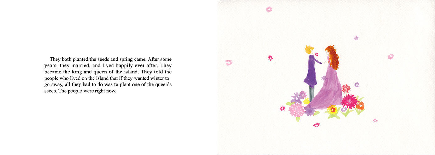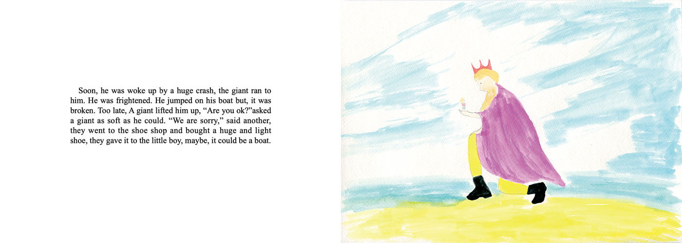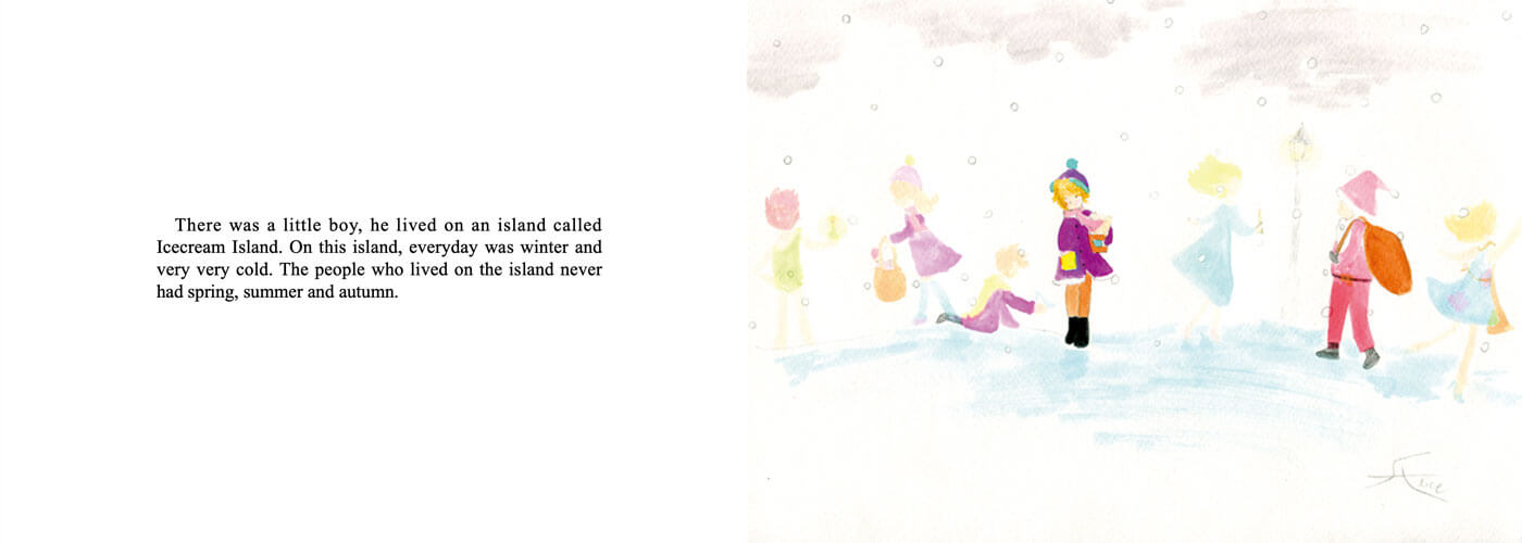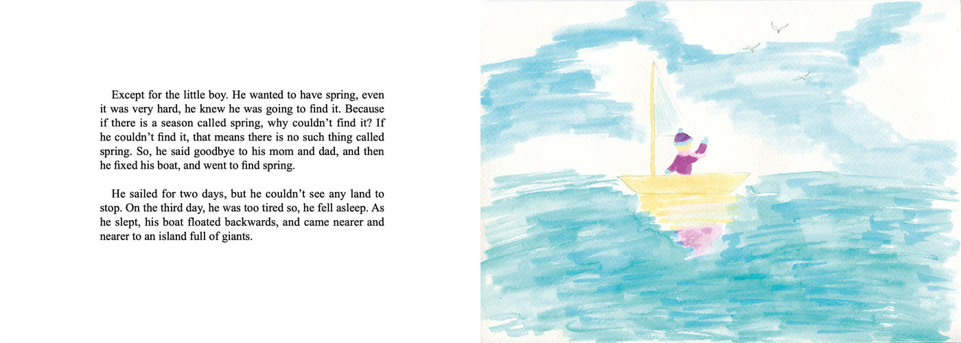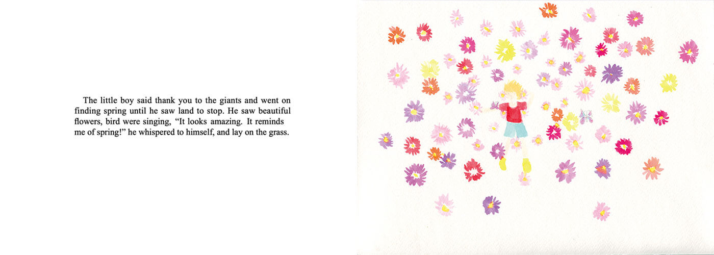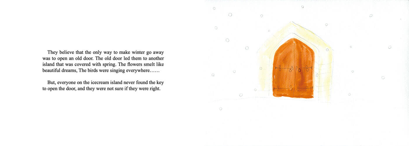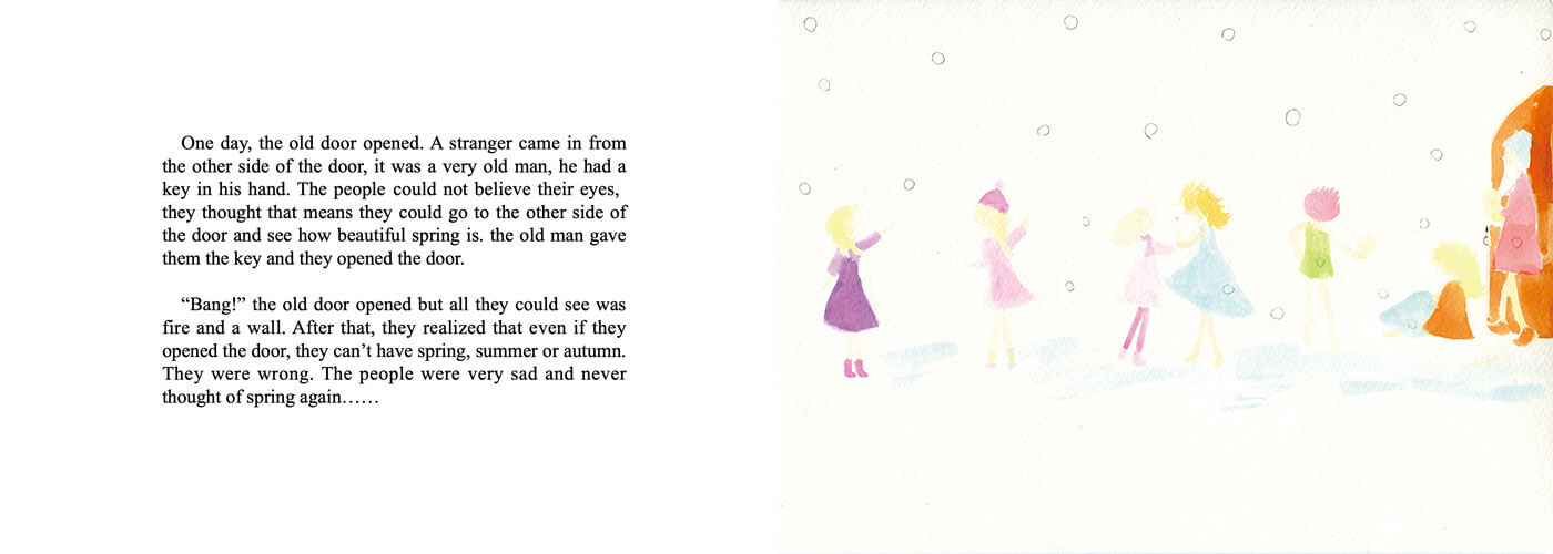 I was inspired by fairytales when creating this picture book. It is probably evident in numerous elements I drew: the mysterious old door, a giant, and the land of eternal spring. I even hid stories inside the pages--on pages 1 and 2, a lot of familiar characters can be found, like Cinderella, Peter Pan, and even Santa Claus.